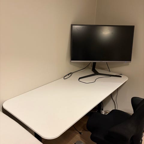 Fint og godt Skrivebord med svart metallunderstell og ek bordplate. Bordet har en rektangulær form og er egnet for bruk som arbeids- eller kontorbord. Understellet gir stabilitet, og bordplaten har en jevn overflate. Selges billig på grunn av renovasjon. Nytt 5 000.