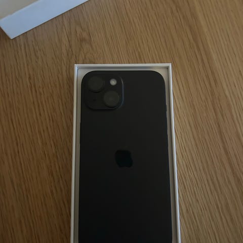 Apple iPhone 15 mobiltelefon med 128 GB lagringskapasitet. Telefonen har en svart farge og er utstyrt med avansert kamerateknologi.