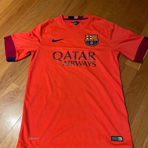 Nike FC Barcelona fotballtrøye i størrelse M, til herre. Trøyen har en rutete mønster i blått og rødt, med FC Barcelonas emblem på brystet. På ryggen står navnet Messi og nummer 10. Laget i Thailand med DRIFIT-materiale for fukttransport.