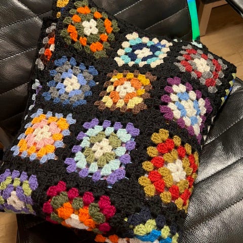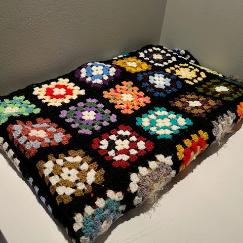 Håndlaget heklet teppe i flerfargede ruter. Laget av forskjellige typer ullgarn alpakka ,merino ,og litt ullblandinger Passer til bruk som sengeteppe eller dekorativt pledd.