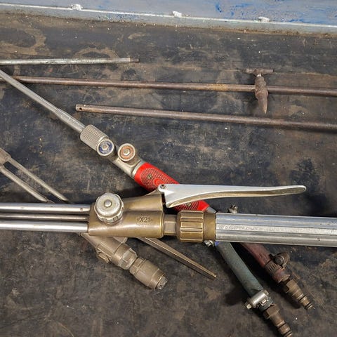 Utstyr komplett uten flasker til skjærebrenner, lodding og autogensveis. Slangene er gamle og bør sikkert byttes.