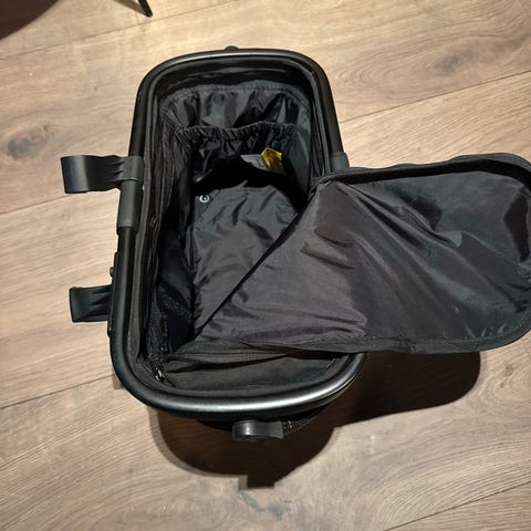 Petite Cherie barnevogn i svart farge. Barnevognen har justerbart håndtak, 5-punkts sikkerhetssele og stor solskjerm. Den er utstyrt med fire hjul og oppbevaringskurv under setet.