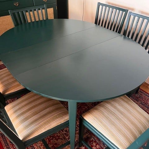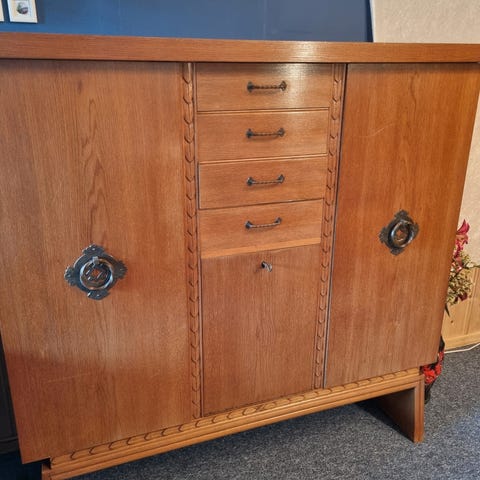 Vintage spisestue solid utførelse. Kjøpt i Oslo på 50-tallet. En eier. Mahogny. 2 ileggsplater. Da er det plass til 10 personer. Har kun 6 stoler. Skapet er i god stand og rommer mye.