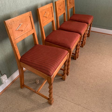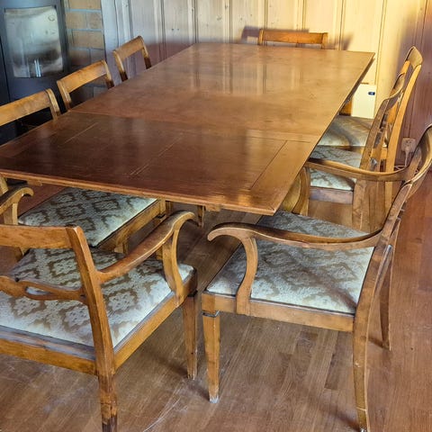 Selger komplett spisestue med 6 stoler og Vitrineskap. Stolene har flekker på stoffet, ellers i god stand. Farge blå/grønn. Ekstra ileggsplate til bord. Strl bord: B:105, L: 135 + ileggsplate 30 cm.