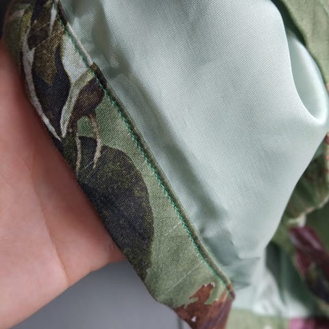 Søtt jerseystoff med mønster av små blomster i farger som rosa, blå og lilla på hvit. Merket "Match master prts by Antex California