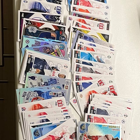 Selger en liten fotballkort samling med ulike spillere fra forskjellige lag og sesonger. Variert verdi.