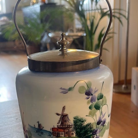Antikk fransk/sveitsiske oppbevaringskrukker i porselen med gull skrift, dekor og detaljer fra tidlig til midten av 1900-tallet.