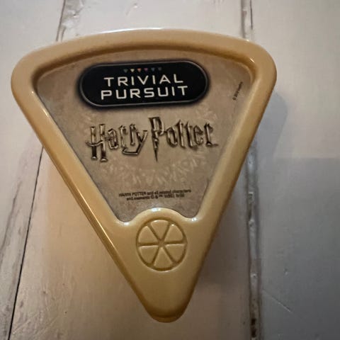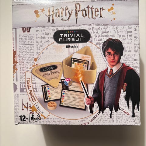 Trivial Pursuit Harry Potter brettspill utvidelse. Inkluderer spillekort, terninger og en spillerbrikke. Brettspillet innholder på spørsmål på engelsk relatert til Harry Potter-universet.