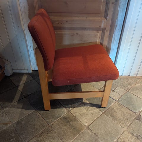 Vintage lenestol i originalt trekk. Trekket har noen skrammer (se bilder), men den er solid og hel i rammeverket. Liker fargen, derfor har jeg ikke trukket den om, men det er kanskje på tide.
