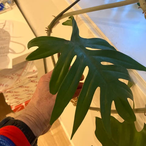 Monstera plante med store grønne blader, egnet som stueplante. Krever moderat lys og regelmessig vanning for optimal vekst.