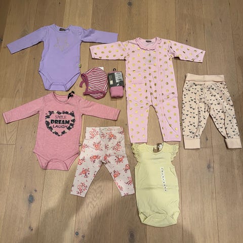 Selger komplett pakke med babyklær i størrelsene 50–56–62, i svært god stand, som nye. Pakken inneholder kvalitetsklær som er pent brukt, samt nyttige tilbehør for den kalde årstiden: ullstrømpebukser og babydyne/teppe.