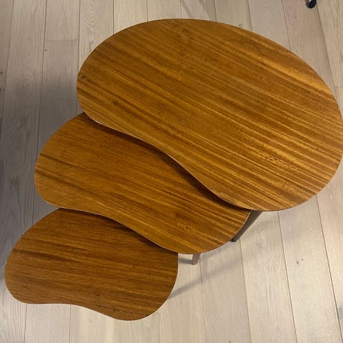 Selger 3 stk Teak Settebord fra 1960-tallet. Noen bruksmerker i bordplatene, kan pusses bort.