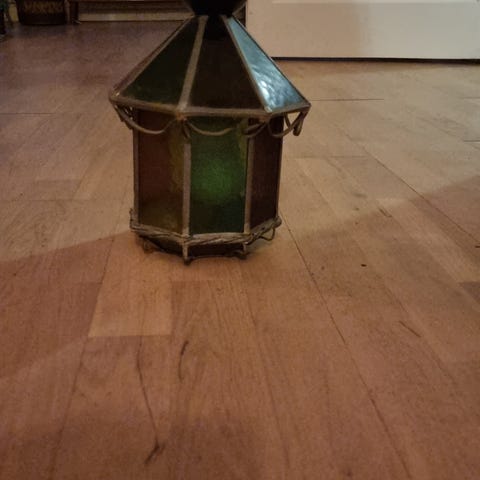 Sjeldent velholdt, solid og dekorativ, vintage taklampe i blyglass. Med tak kopp, krok, kjetting og alle deler inntakt.