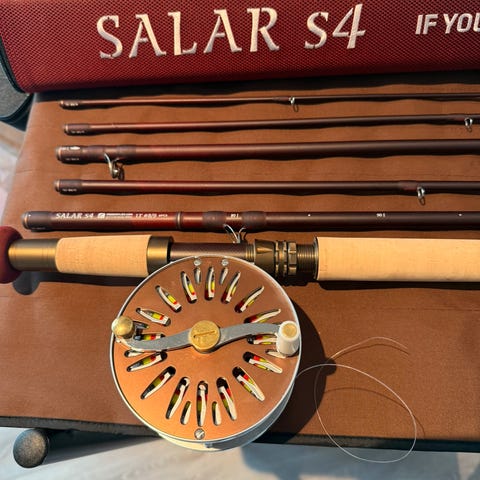 Pent brukt Salar #6/8 snelle med backing og #6 fluesnøre. Kan sendes med Posten.