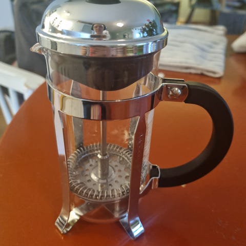 Pent og lite brukt Bodum fransk presskanne / kaffebrygger med oransje håndtak og lokk. Denne fargen er utgått og er nok for spesielt interesserte.