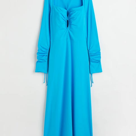En legglang kjole i trikot med mykt fall, firkantet halsringing foran og smale bånd som knytes i nakken. Ekstra lange ermer med snøring og smale knytebånd nederst for en rynket effekt. Søm i midjen og lett utsvingt skjørt med mykt fall.