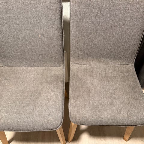 Ørelappstoler gis bort mot henting. Stoffet er utslitt men komforyog treverk like godt