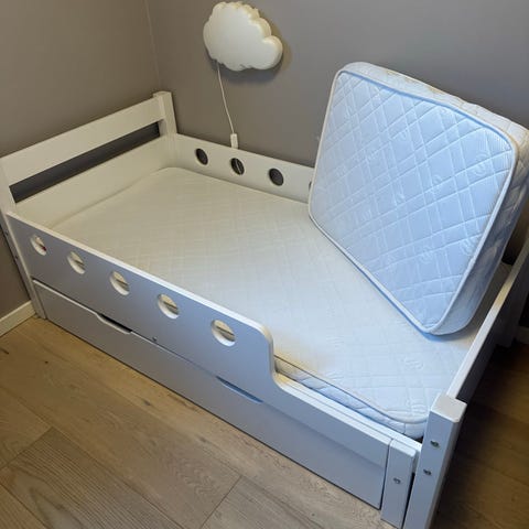 I tillegg til sengerammen medfølger en pent brukt madrass uten flekker, samt 2 stk vanntette madrassbeskyttere og 2 stk laken.