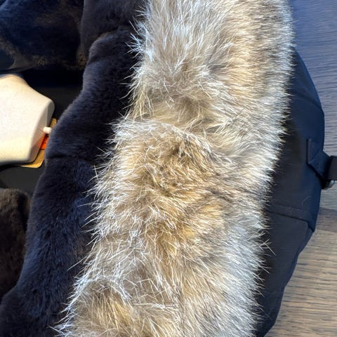 Str 58. Nylon ytterstoff, boble for og kaninpels. Nedfellbar frontklaff.