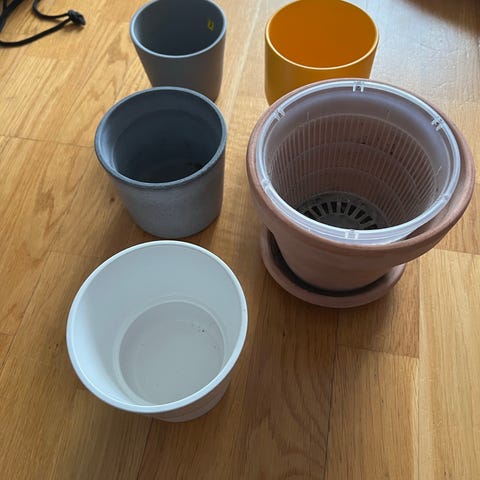 Selger 17 potter med skåler. Gir med en stor sekk plantejord.