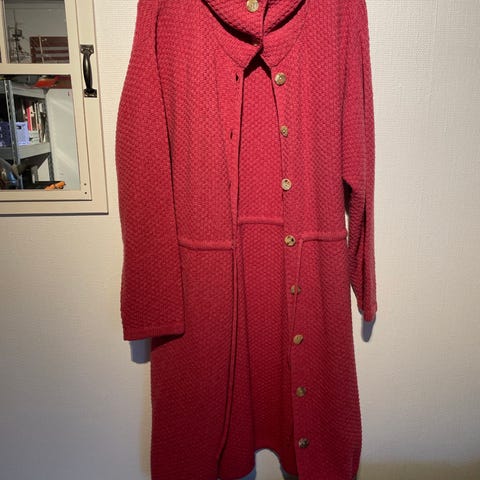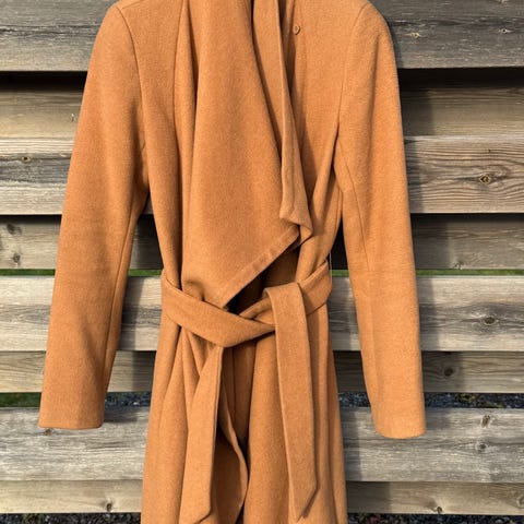 Nydelig vinterkåpe av kamelullstype. 50 % ull/50 % polyester. Kjøpt hos Magasin i København. Ny pris Dkr 1500. L: 105 cm, Ermelengde: 52 cm