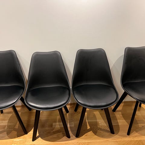 Stolene bærer preg av bruk, men er ellers hele og funksjonelle. Noen flekker som ganske sikkert går bort med litt vask.