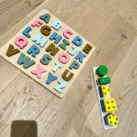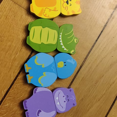 Elleve biter i tre, hodet pluss kropp med ti nummererte biter. Bitene skal også passe sammen uten rekkefølge, så man trenger ikke kunne tallene.
