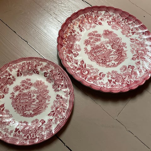 Selger tre vintage tallerkener fra Old Gustavsberg i klassisk rødt mønster.