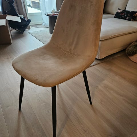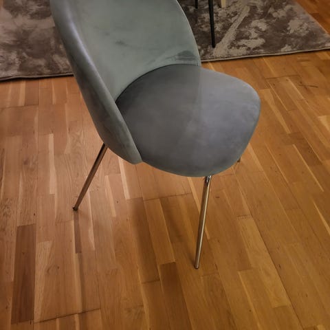 Jeg selger 3 stk. Saturn spisestoler fra Skeidar i fargen sort velur med sortlakkerte ben. Stolene er pent brukt og helt i orden, men på setene har de fått synlige merker etter skruen som er festet på undersiden (se bildet). Nypris på stolene er 999 kr.
