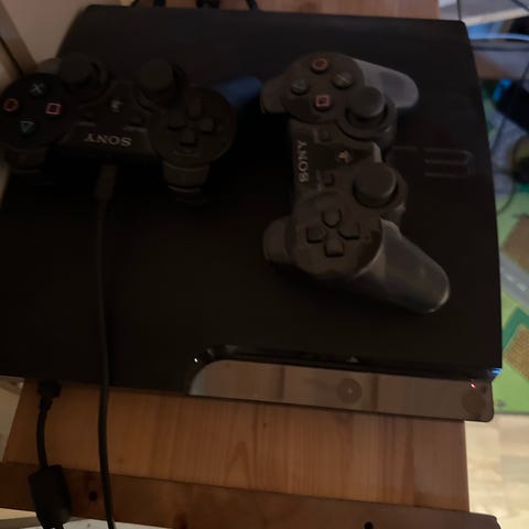 Sony Playstation 3 spillkonsoll med tilhørende kontroller. Konsollen har standard funksjonalitet for avspilling av spill og multimedia.