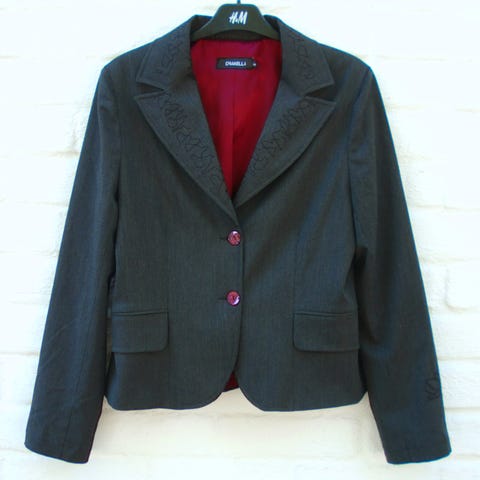 Dranella damejakke og skjørt i størrelse M. Farge svart med mønster. Settet består av en jakke og et skjørt, begge med samme mønster og farge.