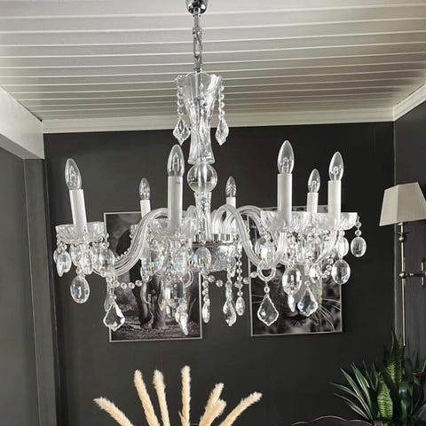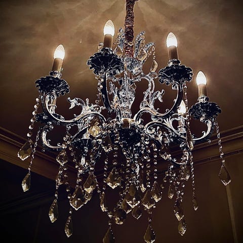 Eldre, velfungerende lysekrone med 5 dimbare led-pærer. Dybde ca 100 - 110 cm. Kjetting.