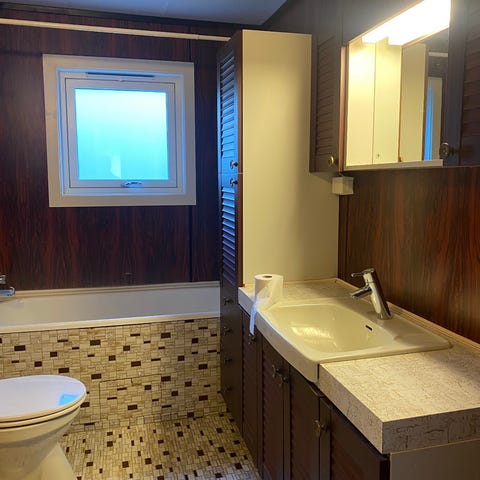 Baderomsinnredning i hvit utførelse fra Foss bad bestående av servant med skuffer og skap, samt høyskap med flere hyller. Grei standard, fra ca 208