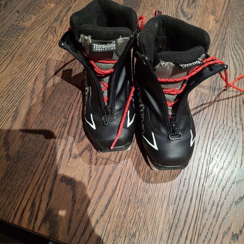 Skiskoene ble kjøpt nye og har vært brukt et par ganger. Skoene er litt små i størrelse (i praksis som en 27, vil jeg tro), så fine som en aller første skisko.