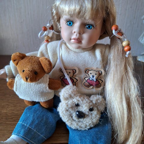 Dukke med porselensansikt og på hender og føtter - 40cm. lang . Kun stått til pynt. Ca. 30 år gammel. Selges kr 75 + porto.