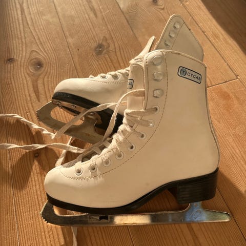 Justerbare barneskøyter i størrelse 30-33. Skøytene har svart og hvit farge, med justerbare spenner for god passform.