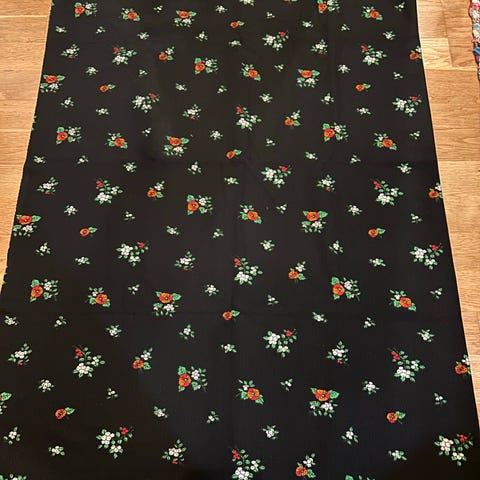 Bomullstoff med mønster av gule roser og grønne blader på hvit og grå rutebakgrunn. Egner seg bl.a. til patchwork. Bredde 90 cm, lengde 177 cm.