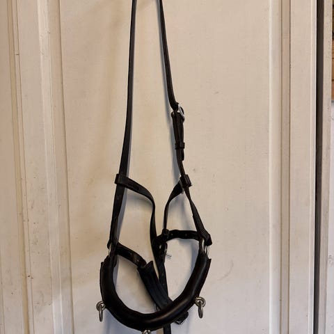 Trinity inne dekken med størrelse 135 cm i blå farge. Alle remmer og gjorder intakte. God polstret «hals» rundt manken så det holder seg oppe og ikke henger på hesten. Brukt på stor kat 1 ponni.