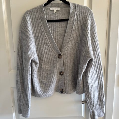 Ribbestrikk. Pene, store plastknapper med marmormønster i brun og beige.