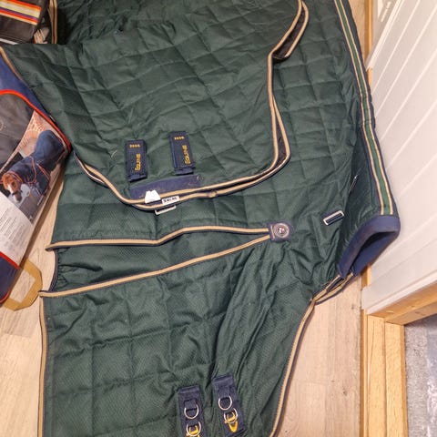 Catago Horse stallteppe med 300 g isolasjon. Brukt på stor kat1 ponni. Farge svart med blå detaljer.
