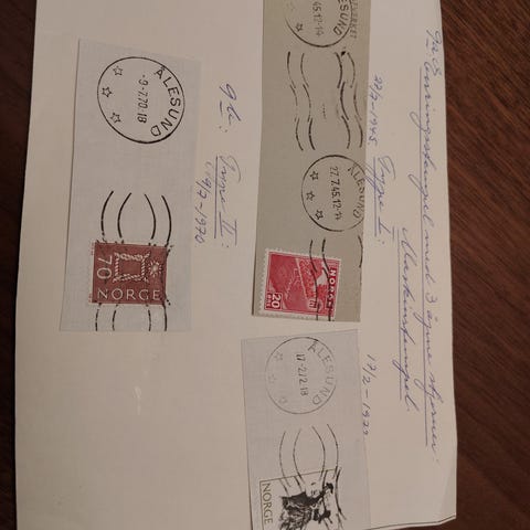 Samling av norske frimerker med ulike stempler fra forskjellige år og steder. Frimerkene er festet på små biter av konvolutter og papir, og viser variasjon i motiv og poststempel. Egnet for frimerkesamlere og de som er interessert i norsk posthistorie.Poststempel fra Asker, Bardu, Nesoddtangen , Volda, Granvin, Sjøholt, Oslo, Ålesund, Stavanger, Skarbøvik, Stranda, Bergen, Sykkylven, Ikornnes, Vestnes, Voss, Valderøy, Prestfoss, Lillehammer, Vigra og mange flere. Hbo 10kr. Har tatt bilde av et utvalg, ikke alle. Står til 15 februar kl 18