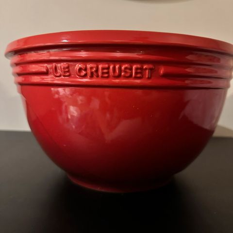 Selger en lekker, stor bolle fra Le Crueset. Den er helt ny og har ikke vært brukt, derfor er produktlappen fremdeles limt fast i bunnen på bollen. Størrelsen er 24 cm Ø og i fargen Carribien.