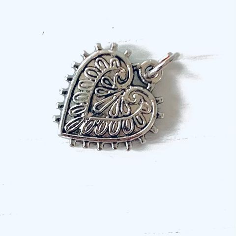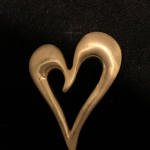 To dekorative hjerteanheng i gullfarget metall. Klassisk design, trolig fra 80–90-tallet. Pent brukt med normal slitasje.