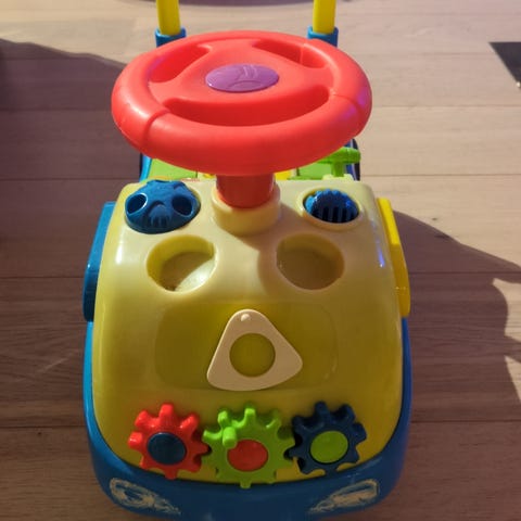 Fisher-Price leke med bilbane og ratt i flere farger. Leken inkluderer en gul bilbane med svinger, et svart ratt og røde seter. Egnet for barn som liker interaktive og motoriske leker. Følger ikke med bilene.