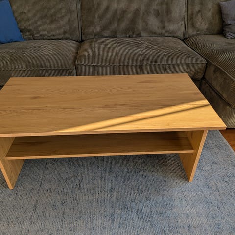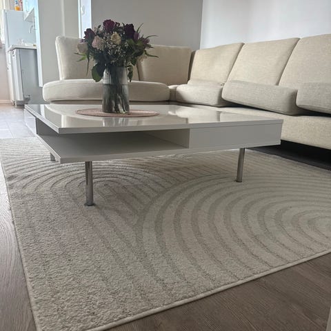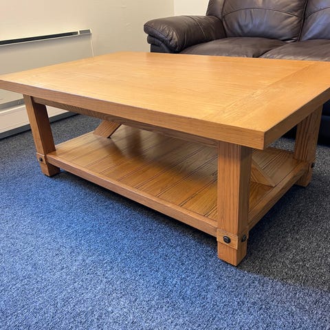 Pent brukt bord. 76 cm bredt, 119 cm langt og 47cm høyt. Hylle under bordplaten