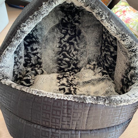 Svart kattehule med pute laget i mykt materiale. Egnet for katter som et hvilested eller kosested. Designet for å gi en lun og komfortabel plass for kjæledyr.