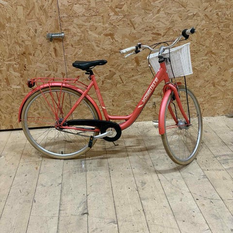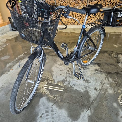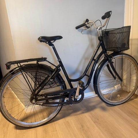Pent brukt dame sykkel med kurv og bagasjebrett, selges nå som den ikke blir brukt. Er en liten bulk bak på bakre skjerm men funker helt fint