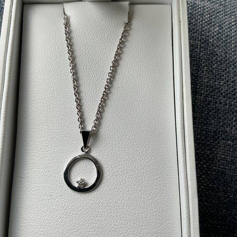 Nytt og ubrukt gullsmykke med anheng i 9 karat hvitt gull, turkis sten og små diamanter på toppen, halskjedet er i sølv.
