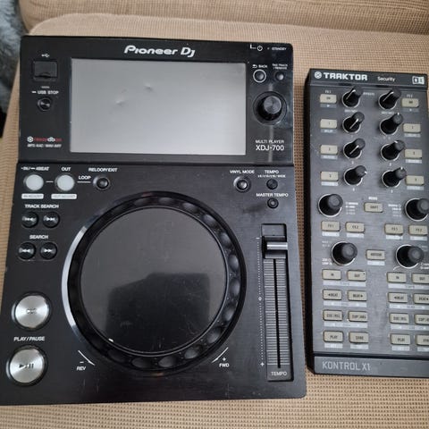 Pioneer bærbare DJ controller DDJ-RR med to store jog wheels, flere kontrollknapper og fader, tilkoblingsmuligheter for hodetelefoner og mikrofon. Enheten har et robust design med flere innganger og utganger for profesjonell DJ-bruk.