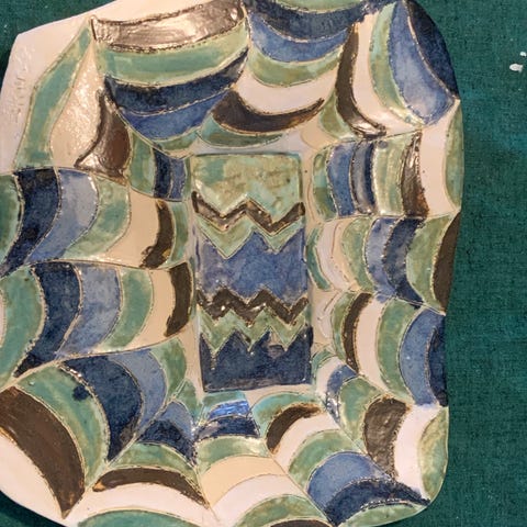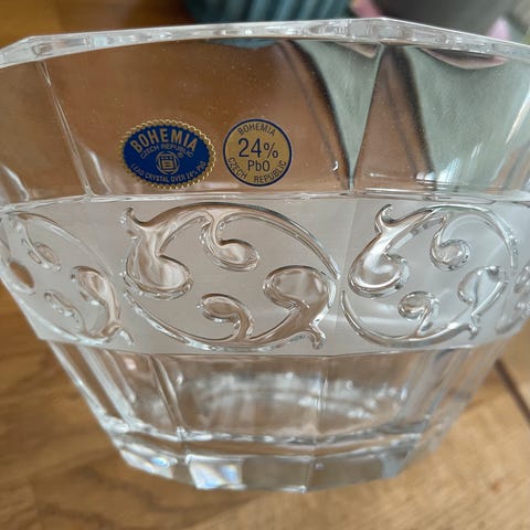 Krystallbolle med asymmetrisk form selges. Tretonet i lilla, klart og gult krystall. Ingen skader eller hakk.